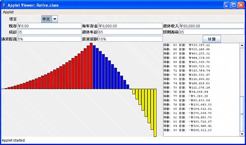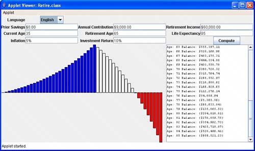 | In this section, we apply the material from this chapter to localize a retirement calculator applet. The applet calculates whether or not you are saving enough money for your retirement. You enter your age, how much money you save every month, and so on (see Figure 10-4). Figure 10-4. The retirement calculator in English  The text area and the graph show the balance of the retirement account for every year. If the numbers turn negative toward the later part of your life and the bars in the graph show up below the x-axis, you need to do something; for example, save more money, postpone your retirement, die earlier, or be younger. The retirement calculator works in three locales (English, German, and Chinese). Here are some of the highlights of the internationalization. The labels, buttons, and messages are translated into German and Chinese. You can find them in the classes RetireResources_de, RetireResources_zh. English is used as the fallbacksee the RetireResources file. To generate the Chinese messages, we first typed the file, using Notepad running in Chinese Windows, and then we used the native2ascii utility to convert the characters to Unicode. Whenever the locale changes, we reset the labels and reformat the contents of the text fields. The text fields handle numbers, currency amounts, and percentages in the local format. The computation field uses a MessageFormat. The format string is stored in the resource bundle of each language. Just to show that it can be done, we use different colors for the bar graph, depending on the language chosen by the user. Examples 10-6 through 10-9 show the code. Examples 10-10 through 10-12 are the property files for the localized strings. Figures 10-5 and 10-6 show the outputs in German and Chinese. To see Chinese characters, install the Chinese fonts. Otherwise, all Chinese characters show up as "missing character" icons. Figure 10-5. The retirement calculator in German  Figure 10-6. The retirement calculator in Chinese  In sum, while the localization mechanism of the Java programming language still has some rough edges, it does have one major virtue. Once you have organized your application for localization, it is extremely easy to add more localized versions. You simply provide more resource files, and they will be automatically loaded when a user wants them. NOTE  | This applet was harder to write than a typical localized application because the user can change the locale on the fly. The applet, therefore, had to be prepared to redraw itself whenever the user selects another locale. If you simply want to display your applet in the user's default locale, you will not need to work so hard. You can simply call getLocale() to find the locale of your user's system and then use it for the entire duration of the applet. |