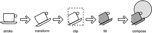 | Of course, in many practical circumstances, you don't need all these steps. There are reasonable defaults for the settings of the 2D graphics context. You would change the settings only if you want to change the defaults. In the following sections, you will see how to describe shapes, strokes, paints, transformations, and composition rules. The various set methods simply set the state of the 2D graphics context. They don't cause any drawing. Similarly, when you construct Shape objects, no drawing takes place. A shape is only rendered when you call draw or fill. At that time, the new shape is computed in a rendering pipeline (see Figure 7-1). Figure 7-1. The rendering pipeline