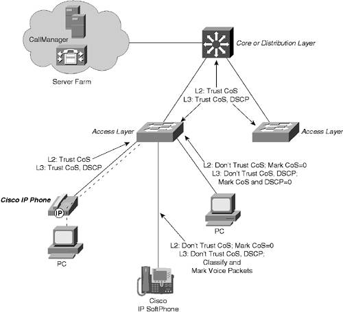 14-2. Voice QoS To support proper delivery of voice traffic in a hierarchical switched network, follow several QoS rules of thumb. See the basic network diagram in Figure 14-1. Figure 14-1. QoS Trust Considerations in a Switched Network