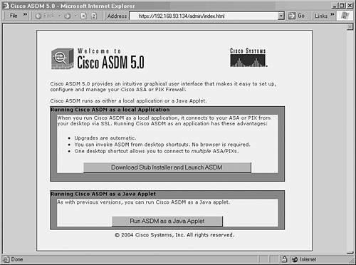 | Starting the PDM or ASDM Application from a Web Browser To run PDM or ASDM from a web browser, point your web browser to the following URL: https://ip_address[/admin] The ip_address is the address (or host name) of the firewall interface that is configured to allow HTTP server connections. The /admin portion of the URL is applicable only to firewalls running PIX 7.0 or later. If the WebVPN feature is also enabled, the security appliance's default web page (https://ip_address) is devoted to WebVPN services rather than ASDM. In this case, you can differentiate between the services by using a more specific URL: NOTE Your browser must allow popups from the firewall's address, because PDM/ASDM is automatically started in a new browser window. As well, PDM/ASDM runs as a Java applet that is downloaded from the firewall. Your browser must support Java so that the applet can be run. As PDM or ASDM begins, you need to authenticate as an administrative user. The firewall can have an authentication method that is specific to HTTP connections, configured with the aaa authentication http console command. Depending on the configuration, you need to use one of the following credentials: Default authentication No usernames are defined or used. Therefore, leave the username field blank and enter the enable password. Local authentication Usernames are used and are defined locally on the firewall with the username command. Enter a valid username that can use privilege level 15 (enable or privileged EXEC mode) and the appropriate password. AAA authentication Usernames are used and are defined on external AAA servers. Enter a valid username that can use privilege level 15 (enable or privileged EXEC mode) and the appropriate password. TIP When the PDM or ASDM application connection is initiated, the firewall sends its self-signed SSL certificate to your web browser. Sometimes a browser cannot verify the certificate because the firewall is not known as a trusted certificate authority. If this happens, you likely will see a message from the web browser. You can choose to accept the certificate temporarily or permanently if you are comfortable that you are connecting to the correct firewall. You can check the firewall's identity by viewing the certificate; the Common Name (CN) attribute is made up of the firewall's host name and domain name. You might also see an error regarding a domain name mismatch. If the firewall's interface IP address is not registered in a DNS, the browser cannot confirm that its IP address and certificate CN (fully qualified domain name) correlate. If you are comfortable with the mismatch, you can choose to continue. Starting ASDM from a Local Application Beginning with PIX 7.0, you can run ASDM from a web browser or from a "launcher" application that has been downloaded directly to your PC. The first time you use ASDM, you should point your web browser to the following URL: https://ip-address/admin This brings up a web page where you can choose the ASDM access method. Figure 4-8 shows an example of this opening page. Figure 4-8. Initial ASDM Launch Page  Running ASDM as a local application is usually better because you can use one common program on your PC to access one or more firewalls running PIX 7.x. The application also maintains a drop-down list of firewall addresses where you have connected in the past, making it easy to select a target firewall without having to use browser bookmarks or enter URLs. When the local application is installed, an installer file is downloaded, as shown in Figure 4-9. The installer runs automatically. Figure 4-9. Local ASDM Application Installation