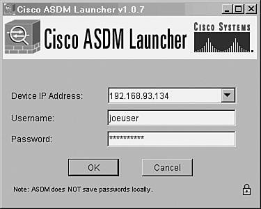To run the ASDM launcher application, start the local Cisco ASDM Launcher program. On a Windows PC, it can be found on the Start menu under Programs > Cisco ASDM Launcher. When the launcher starts, it displays a drop-down list of firewall addresses it knows about. Select an address from the list and enter your authentication credentials. Figure 4-10 shows an example of the launcher application. Figure 4-10. Local ASDM Launcher Application