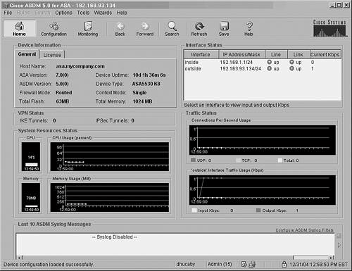 After you have authenticated, the firewall downloads the most current ASDM application code to your PC via the launcher application. This means the local application rarely needs to be updated. Instead, the PC is always kept current with the actual ASDM software that is contained in the firewall's ASDM image. As soon as ASDM launches, it looks like the window shown in Figure 4-11. Figure 4-11. Sample ASDM Session  User Session Banners You can configure a banner of text that the firewall will display to any administrative users. You can use the following three types of banners: Message of the Day (MOTD) An informational message that is shown before the login prompt in a Telnet, SSH, or console session. This might include network news, access policy information, or legal warnings to be presented to potential users. Login A message that is shown after the MOTD prompt and just before the firewall login prompt. This might be useful to show a name, location, or other access parameters. Exec A message that is shown just after a user successfully logs in and reaches EXEC mode. This might be useful if you need to present some final words of caution or a warning to the user who has just logged in and is about to view or change something on the firewall. To configure one of these banners, use the following configuration command: Firewall(config)# banner {exec | login | motd} text Here, the banner is created one line of text at a time. Don't enclose the text in quotation marks; the text begins after the banner type keyword and ends at the end of the line. Repeat this command for subsequent lines of the banner. You can't edit a banner; you have to delete the entire banner with the no banner {exec | login | motd} command and re-enter it. To delete banners of all types, you can use the clear banner (PIX 6.x and FWSM 2.x) or clear configure banner (PIX 7.x) command. You can also customize the banner's appearance by including the firewall's host name or domain name. This is done automatically by inserting the token strings $(hostname) and $(domain) within the banner text. The firewall substitutes the current values configured by the hostname and domain-name commands. TIP If you decide to use banners on your firewall, be careful what information you include. Remember that the MOTD and login banners are displayed as soon as a Telnet or SSH session connection is opened to the firewallwhether someone can log in or not. That means if someone can initiate a Telnet session and see the login prompt, he can also see any detailed banner information that might reveal the firewall's location, model, software version, and so on. Also be careful when you craft a banner message. Most security and legal experts advise against using any type of "Welcome" or "Greetings" message, because this might be used against you. Malicious users might try to suggest that you welcomed them into your firewall! For some best-practice recommendations, refer to http://www.cisco.com/warp/public/707/21.html#warning. Monitoring Administrative Sessions Having a console interface and network access, a firewall can allow several people to be connected at any time. You can monitor all the active Telnet sessions on a firewall with the EXEC command who, which provides a list of Telnet session numbers along with the originating IP address, as in the following example: Firewall# who 1: 172.21.4.16 Firewall# If you need to close a Telnet session that is either hung or unwanted, use the who command to find the session's index number. Then use the kill telnet_id privileged EXEC command, where telnet_id is the session index, to terminate that session immediately and without warning. For example, the following commands could be used to end the Telnet session coming from IP address 10.6.6.6: Firewall# who 0: From 10.10.10.71 1: From 192.168.199.4 2: From 10.6.6.6 Firewall# kill 2 You can also monitor active SSH sessions with this EXEC command: Firewall# show ssh sessions For example, a generic user ("pix") has several SSH sessions open. Notice that SSH version 1 is actually shown as version 1.5. Version 1.5 is commonly used with Cisco IOS software and has several security fixes beyond that of version 1.0. Firewall# show ssh sessions SID Client IP Version Mode Encryption Hmac State Username 0 172.21.4.14 1.5 - 3DES - SessionStarted pix 1 172.21.4.14 2.0 IN aes256-cbc sha1 SessionStarted pix OUT aes256-cbc sha1 SessionStarted pix 2 172.21.4.14 1.5 - 3DES - SessionStarted pix 3 172.21.4.14 1.5 - 3DES - SessionStarted pix 4 172.21.4.14 1.5 - 3DES - SessionStarted pix You can disconnect an active or hung SSH session with the following command: Firewall# ssh disconnect session-id To display the active PDM or ASDM management application sessions, you can use the following command: Firewall# show pdm sessions You can disconnect an active PDM session with the following command: Firewall# pdm disconnect session-id TIP A firewall can also generate an audit trail that shows user activity. To do this, logging must be enabled on the firewall. See Chapter 9, "Firewall Logging," for logging configuration details. User authentication messages are generated at Syslog severity 6 (Informational). This also includes SSH and PDM sessions. User privilege level event messages are generated at Syslog severity 5 (Notification). Firewall commands executed by users are logged at Syslog severity 5 (Notification), and show commands executed are logged at Syslog severity 7 (Debugging).