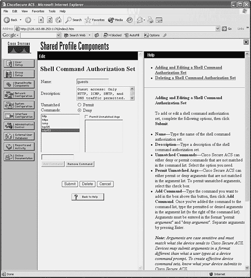 For example, suppose a CiscoACS server is configured with a command authorization set called guests that allows HTTP, ICMP, SMTP, and DNS traffic from any host. Figure 5-5 shows the Shell Command Authorization Set configuration page. Each of the protocols is listed as a "command" by using a keyword or the protocol/port.