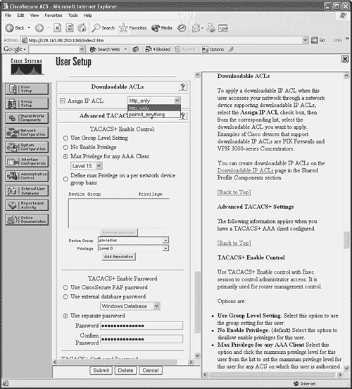 In CiscoACS, go to User Setup or Group Setup. In the Downloadable ACSs section, check the Assign IP ACL box and select the appropriate ACL from the drop-down list. In Figure 5-9, the http_only ACL has been selected and will be downloaded when the user authenticates with the CiscoACS server.