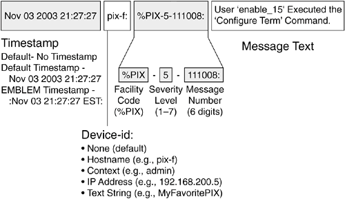 Logging messages can be sent to any of the following destinations: The firewall console Telnet or SSH sessions to the firewall A temporary buffer internal to the firewall SNMP management stations Syslog servers Firewall management applications such as Cisco Adaptive Security Device Manager (ASDM 5.0) and Cisco PIX Device Manager (PDM 3.0 and 4.0) E-mail addresses (PIX 7.x only) An FTP server (PIX 7.x only) Firewall Flash (PIX 7.x only) The logging level can be set to determine which messages should be sent to each of the destinations. When you set a severity level for a destination, all messages with a lower severity level are also sent. You should always add time stamps to Syslog messages to help in real-time debugging and management. The firewall can add time stamps as messages are generated, or a Syslog server can add time stamps as messages are received. TIP You should have all your network devices use a common time reference point so that all the time stamps on all logging messages are synchronized. You can do this by configuring firewalls, routers, and switches to use one or more authoritative NTP servers as a time source. If you have some NTP servers inside your network, each network device can synchronize time with them. However, if you intend to use NTP servers on the public Internet, you should use a hierarchical approach. Select two routers within your network to synchronize time with the Internet servers. Optimally, each router should peer with three unique time sources so that none of them are duplicated. Then point all your inside devices to synchronize time with the routers. The idea is to contain the bulk of NTP synchronizations within your network rather than have a multitude of hosts peering with the Internet servers. You can configure a unique "device ID" so that logging messages from a firewall can be readily identified. This becomes important when one Syslog server collects messages from many different firewalls, routers, and switches. Figure 9-1 shows each of the logging severity levels, along with a general list of the types of messages generated. Each level also includes every level below it. The higher the severity level, the more types of messages that are included. Figure 9-1. Syslog Severity Levels and Their Messages  System messages are logged in either the default or EMBLEM format. Figure 9-2 shows the default message format. Each message has the following fields: Time stamp The date and time from the firewall clock. The default is no time stamp. Device ID Added to uniquely identify the firewall generating the message. Can be the firewall's host name, an interface IP address, or an arbitrary text string. The default is no device-id. Message ID Always begins with %PIX-, %ASA-, or %FWSM-, followed by the severity level and the six-digit message number. Message text A description of the event or condition that triggered the message. Figure 9-2. Firewall Logging Message Format