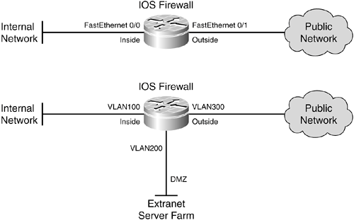 11-3. Configuring IOS Firewall Stateful Inspection An IOS firewall can inspect traffic passing through according to the expected state or behavior of each protocol used. This stateful inspection process is called Content-Based Access Control (CBAC). When a router becomes an IOS firewall by enabling CBAC, you should begin to think of the router interfaces in firewall terms. Some of the interfaces are connected to protected networks, where data or services must be secured. Others connect to public or unprotected networks, where untrusted users and resources are located. For example, the FastEthernet 0/0 interface might become the inside firewall interface. FastEthernet 0/1 might become the outside interface, because it lies toward the Internet. The same thing can be said of logical VLAN interfaces if they are switched virtual interfaces (SVIs) that route traffic. Figure 11-6 provides an example. Figure 11-6. Designating IOS Firewall Interfaces  The top portion of the figure shows an IOS firewall with only two interfaces, which connect to the inside (more secure) and outside (less secure) networks. The bottom portion of the figure shows an IOS firewall with three interfaces, connected to the inside (most secure), DMZ (less secure), and outside (least secure) networks. The IOS firewall has no concept of these interface designations or security levels; these concepts are put into play by the inspection processes and policies that are configured. Consider each interface that is involved in traffic inspection. The IOS firewall can inspect data that travels into each interface as it moves toward another interface. As well, traffic coming out of an interface has just come from another interface. The IOS firewall maintains the relationship between pairs of interfaces, in which traffic originates on one interface and is destined for another. Therefore, you have to know which interfaces are considered more secure than others. How CBAC Works CBAC inspection is not inherent in an IOS firewallit must be configured. However, the CBAC concept is simple, and the configuration isn't very complicated. CBAC inspection occurs in one direction (in or out) on an interface. (You can configure two CBAC processes, one for each in or out direction, but you don't have to.) For the sake of this discussion, assume that only inbound inspection is configured on the inside IOS firewall interface. Figure 11-7 shows this arrangement, along with the inspection mechanism. Figure 11-7. CBAC Inspection on an IOS Firewall with Two Interfaces  As packets from the inside pass into the inspected interface, toward the outside, the following things happen: 1. | The packets are filtered by an inbound access list (access-list 1, for example) on the interface if one is configured. This can be useful if you need to control what types of traffic your trusted users are allowed to initiate.