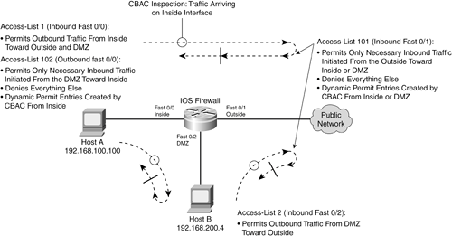 Stateful inspection gets slightly more complex when an IOS firewall has more than two interfaces. Figure 11-8 shows how CBAC works on a firewall with three interfaces. The concept is no different from that of Figure 11-7, where only two interfaces are involved. Figure 11-8. CBAC Inspection on an IOS Firewall with Three Interfaces  When CBAC inspection is enabled on an interface, traffic destined outbound triggers the inspection, and return traffic is allowed back through the interface. In Figure 11-8, the Inside and DMZ interfaces have CBAC inspection enabled because they generally support users or hosts that connect to resources on the outside network. Inspection is not enabled on the outside interface simply because the outside network is considered insecure. The only inbound traffic that is allowed to get in from the outside is identified and permitted by an access list applied to the outside interface. Configuring CBAC Inspection Follow these steps to configure CBAC inspection on an IOS firewall: 1. | Identify an interface that will be inspected, along with the traffic direction.