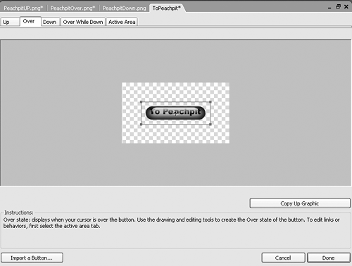 Figure 8.18. Use the Fireworks Button Editor to add the button symbol's Up, Over, and Down states quickly.