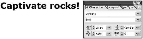 | 4. | Enter the words "Captivate Rocks!," set the point size to 24 points, choose Verdana as your font, and set the weight to bold (Figure 9.19).