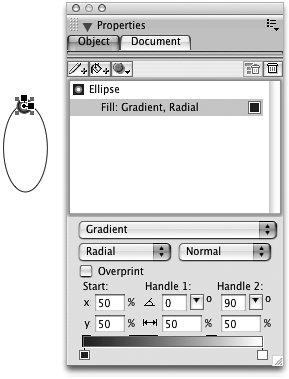 | 2. | Draw a circle that is 20 pixels wide by 20 pixels high. Fill the circle with a Radial gradient by selecting Gradient from the pop-down list in the Fill panel and then selecting Radial Gradient from the list. Drag the small circle to the top of the large circle (Figure 9.23).
