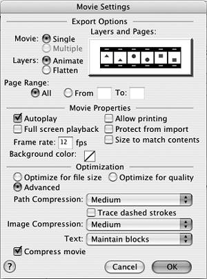 Figure 9.28. The Movie Settings dialog box determines how the Flash SWF will be created and how it will play.