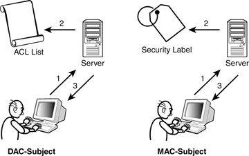 A MAC model is static and based on a predetermined list of access privileges; therefore, in a MAC-based system, access is determined by the system rather than the user. Figure 4.3 shows the differences between DAC and MAC. The MAC model is typically used by organizations that handle highly sensitive data (such as the DoD, NSA, CIA, and FBI). Systems based on the MAC model use sensitivity labels. Labels such as Top Secret, Secret, or Sensitive are assigned to objects. Objects are passive entities that provide data or information to subjects. A subject can be a user, system, program, or file. When a subject attempts to access an object, the label is examined for a match to the subject's level of clearance. If no match is found, access is denied. Important items to know about the MAC model include these: