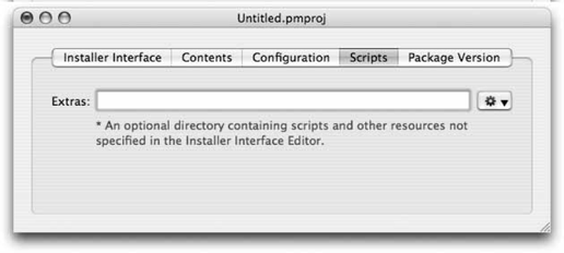 Extras The optional Extras directory contains scripts and other resources such as README files, that are used by the installer but aren't specified in the Installer Interface Editor. See PackageMaker's help for details. Figure 15-5. PackageMaker's Scripts tab
