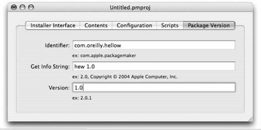 Figure 15-6. PackageMaker's Package Version tab  After you have filled in the package settings, select Project Build to create the .pkg file or select Project Build and Run to create the .pkg file and install the package. After creating the .pkg file, to install it, double-click on the file and install as you would any other Mac OS X package. When you quit PackageMaker, youll be prompted to save the PackageMaker session with its currently filled in values as a .pmproj document. If you subsequently double-click your .pmproj document, PackageMaker will open with the values that were saved in the .pmproj file.  | Iceberg is provided by Stepane Sudre as an alternative to PackageMaker. (It is available at http://s.sudre.free.fr/Software/Iceberg.html.) |
