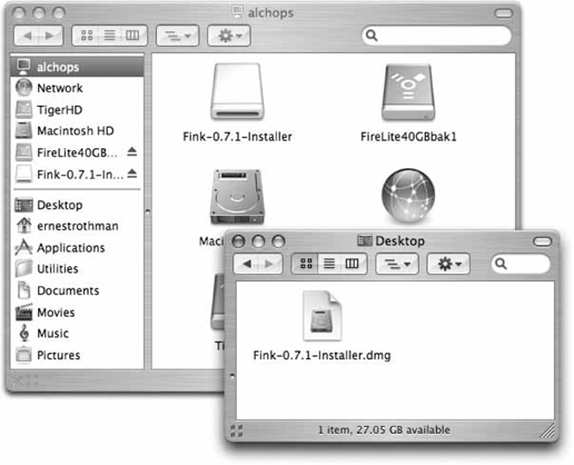 Figure 15-7. A disk image and its mounted volume  Disk images can be created by using Disk Utility (/Applications/Utilities) or via the command line (described later). There are two types of disk images. One is a dual fork disk image with a .img extension, and the other is a single fork disk image with a .dmg extension. A dual fork disk image requires additional (MacBinary) encoding in order for it to be transferred across networks. The single fork version is preferred for distributing software in Mac OS X, as it requires no additional encoding and, as we shall see later, can be "Internet-enabled." The Unix command df reveals a disk image as a mounted volume that will appear in the /Volumes directory. When you are done with the mounted volume, unmount it by clicking on the volume (in Figure 15-7, the mounted volume is named Fink 0.7.1 Installer) to select it and choose File Eject ( -E). You could also Control-click and select Eject Disk from the contextual menu, or drag the mounted volume to the Trash. 15.3.1. Creating a Disk Image with Disk Utility To create a disk image using Disk Utility, perform the following steps: Launch Disk Utility (/Applications/Utilities). Either select File New Blank Disk Image or click the New Image icon from the toolbar. Either way, Disk Utility prompts you for a name, location, size (the maximum size is limited by available disk space), encryption options, and format, as shown in Figure 15-8. If you choose to enable encryption, Disk Utility will prompt you for a passphrase. Figure 15-8. Creating a new blank image with Disk Utility