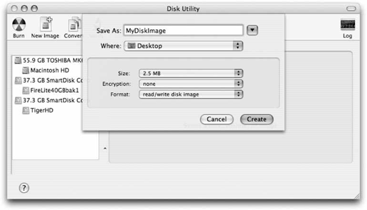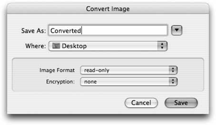 In the Convert Image window, enter either a new name or the same name in the Save As field, and then select read-only from the Image Format pull-down menu, as shown in Figure 15-12. (You can also compress the disk image from this menu.) Click the Save button. If you've given the disk image the same filename as the original image you created, an alert window appears, asking you to confirm whether you want to replace the older file with the new one. Click Replace to finish the process, then quit Disk Utility with -Q. Figure 15-12. Converting an image in Disk Utility  15.3.2. Creating a Disk Image from the Command Line The following example illustrates how to create a disk image at the command line. Change (cd) to the directory where you want to create the disk image: $ cd ~/Documents Create the disk image of a given size (10 MB in this example) using hdiutil: $ hdiutil create -megabytes 10 -fs HFS+ \ -volname SampleVol Sample.dmg Mount the image as a volume. Since you named it SampleVol when you issued the hdiutil create command, it will be mounted as SampleVol and will be available in /Volumes/SampleVol: $ hdiutil mount Sample.dmg Use the Finder or command-line tools to write to the volume SampleVol. When you are done writing to the volume, you can eject it with hdiutil unmount: $ hdiutil unmount /Volumes/SampleVol/ Copy the disk image to a compressed, read-only image named Ready4Dist.dmg: $ hdiutil convert -format UDZO Sample.dmg -o Ready4Dist.dmg  | The UDZO format option is used to create a UDIF zlib-compressed image. Other formats can be chosen, for example, UDIF bzip2, which is available for Mac OS X 10.4+ and can be selected with the UDBZ format option. For a complete list of format options, see the manpage for hdiutil. |