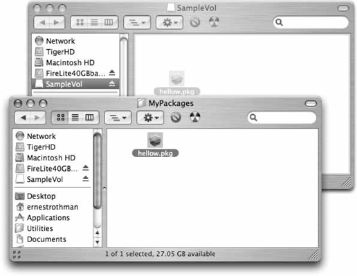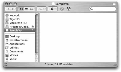 Name the new image "MyDiskImage" and choose the Desktop as the location. The new image will be created as MyDiskImage.dmg and mounted as MyDiskImage. You can change this Volume name to, say "SampleVol," in the Finder. Double-click on the disk icon to open the empty volume in a Finder window, as shown in Figure 15-9. Select File New Finder Window (or -N) to open a new Finder window, where you can select the files you want to place in the disk image, as shown in Figure 15-10. To copy the files to the mounted volume, select and then drag the items into the empty SampleVol window. Figure 15-9. A blank disk image, ready to be loaded up with files  Figure 15-10. Copying the file to the disk image