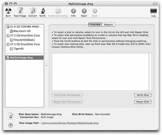Whenever you want to mount this volume again, double-click the file Ready4Dist.dmg in the finder. Note that the writable disk image Sample.dmg is not destroyed in this process. 15.3.3. Distributing Your Image Once you've created a disk image, you can share it with the world. Put the image up on a web server or FTP server for others to enjoy, share it on your iDisk, or burn it to a CD using Disk Utility (select either select Images Burn or press -B). 15.3.3.1. Internet-enabled disk images An Internet-enabled disk image is a read-only disk image that cleans up after itself, leaving only the software and no by-products of the download. If you distribute your software as an Internet-enabled disk image, the user just needs to perform these steps: Download the .dmg file to the Desktop (i.e., ~/Desktop) using a web browser. When the download completes, the following sequence of events happens automatically: The .dmg file is mounted. Its contents are copied to the user's default download folder (e.g., ~/Desktop). The disk image is unmounted. The Internet-enabled flag of the .dmg file is set to No. The .dmg file is moved to the Trash.