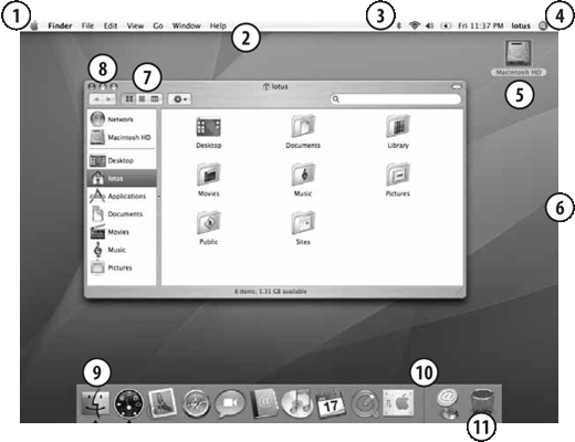 Appendix A. Mac OS X GUI Primer If you're a Unix Geek who's new to Mac OS X, some of the terminology may not be that obvious. Although you know what most things do, you probably haven't connected them with their street names. This short appendix gets you up to speed with what everything's called, and provides some details on what each of them does. Figure A-1 shows Mac OS X's desktop. Each numbered item is explained in the following list: Legend has it that the Apple menu almost didn't survive the transition from the classic Macintosh operating system into Mac OS X, but that the cries of the faithful kept it there. This menu leads to more information about your Mac, quick access to Dock, Network, and System Preferences, as well as recently-opened documents and options for sleeping, restarting, and shutting down the system. The menu bar is where the frontmost application's menus appear. Unlike Windows and Linux desktops like GNOME and KDE whose menus are attached to individual windows, Mac OS X's menu bar changes appearance and function based on which application is in the foreground. Some parts of the operating system, including Bluetooth networking, AirPort, and your battery, install a menu extra in the rightmost side of the menu bar. Use these to check the status of these items and click the menu extra for a menu that lets you adjust things. Command-drag to rearrange your menu extras, or Command-drag an item off of the menu bar to consign it to oblivion (to bring it back, you'll need to poke around System Preferences to find the appropriate option). Notice that the username appears to the right if you have more than one user on the Figure A-1. The Mac OS X desktop