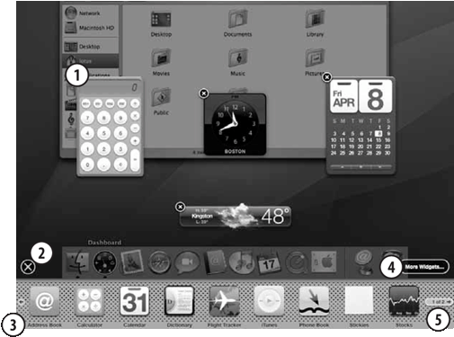 Choose a widget from this list and it immediately appears on the Dashboard. There are more widgets available online (see http://www.apple.com/macosx/dashboard); click this button to open your browser up to Apple's list of additional Dashboard widgets. If you've installed more widgets than can appear onscreen, click here to see them. Dashboard lets you keep frequently-accessed information at your fingertips without cluttering up your Desktop. If there's a widget you want that doesn't already exist, all you need is a little JavaScript and HTML skill to build it. For more information on how to create your own Dashboard widgets, see http://developer.apple.com/macosx/tiger/dashboard.html. |