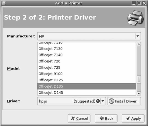 The Driver Selection screen appears. This displays all the detected drivers for your printer, as shown in Figure 6-17. Choose the correct one, and click Next. At this point, you're prompted to test the printer. When we tried it, it didn't work, but it wasn't a showstopper. If it doesn't work for you, click Next anyway and keep on moving through the Wizard. There are a few more screens: Banner Selection, Printer Quota Settings, and Users Access Settings. Leave the defaults and click Next for each one. Figure 6-14. Specifying the CUPS backend for your printer