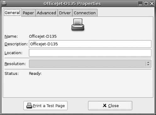 CUPS provides System V- and Berkeley-compatible command-line interfaces and a web-based interface to extensive documentation, status monitoring, and printer administration. You access the web-based administration interface by pointing your web browser to port 631 on the localhost (http://127.0.0.1:631). (To access CUPS from a remote machine, enable Printer Sharing (System Preferences Sharing), and use your machines IP address instead of 127.0.0.1.) The main page of the web-based administrative interface is shown in Figure 6-7. Figure 6-7. CUPS' web-based interface  6.2.1. Printing from Remote Systems CUPS is available on a wide variety of Unix-based systems and makes both the administration and use of shared printers easy. For example, a shared USB printer connected to your Mac is immediately visible to a Solaris-based SUN workstation running CUPS, provided the Solaris machine is on the same subnet (if not, remote users can connect to the printer by supplying your Mac's IP address or hostname). GNOME and KDE, the most popular desktop environments for Linux, have utilities that make it easy to connect to a printer you've shared from your Mac. Before you proceed, you should find out the queue name of your printer, as described in the following steps: Open the Printer Setup Utility (/Applications/Utilities). Select your printer and click the Show Info icon. The Printer Info dialog appears; make sure Name & Location is selected at the top of the dialog. Figure 6-8 shows the settings for an HP OfficeJet D135 connected to the USB port. The queue name for this printer is "officejet d series." Figure 6-8. Inspecting the properties for an HP OfficeJet  6.2.1.1. GNOME To connect to your Mac's printer from GNOME : Launch the GNOME CUPS Manager. This may appear in a menu (on Ubuntu Linux, select Computer System Configuration Printing), or you can run the command gnome-cups-manager. The CUPS Manager appears as shown in Figure 6-9. In Step 1, select Network Printer (CUPS Printer) and specify the URL of your printer. The URL is of the form http://HOST:631/printers/queuename, as shown in Figure 6-10. Click Next. In Step 2 (Figure 6-11), select the manufacturer and printer model. Click Apply. The Add a Printer dialog box disappears, and you'll be back in the GNOME CUPS Manager (an icon should now be visible for your newly-added printer). Print a test page. Right-click on the printer you just added, select Properties, and click Print Test Page from the dialog that appears (Figure 6-12). Figure 6-9. The GNOME CUPS Manager  6.2.1.2. KDE To connect to your Mac's printer using KDE, launch the KDE Control Panel and choose Peripherals Printers. You may find that your printer is already detected, as shown in Figure 6-13. Depending on whether your Linux system can resolve your Macs hostname properly, this printer may work as-is. Figure 6-10. Adding a new printer under GNOME  Figure 6-11. Specifying the printer's make and model  Figure 6-12. Printing a test page   | Right-click on the printer, select Printer IPP Report, and browse the results. If you see "Unknown host" and/or "Unable to lookup host" in the printer-state-message, it probably won't work out of the box. |