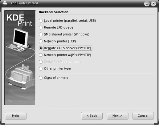 In our case, it didn't work out of the box. You can follow these steps to add the printer manually: Click Add Add Printer/Class. The Backend Selection appears (Figure 6-14). Choose Remote CUPS Server (IPP/HTTP) and click Next. The next screen asks for use identification. Leave this set to the default (Anonymous) and click Next. Specify your Mac's IP address and CUPS port (normally 631) as shown in Figure 6-15. Click Next. You'll see a list of shared printers on your Mac, as shown in Figure 6-16. Choose one and click Next. The next screen asks you to select the printer manufacturer and model. Click Next when you're done. Figure 6-13. KDE will usually detect your shared printer