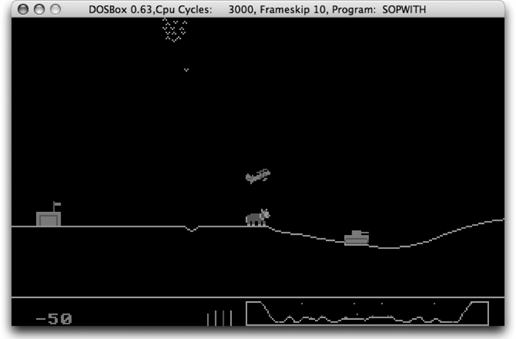 Fun Got an old MS-DOS game you want to play on your Mac? Nothing beats an emulator for running these old games (see Figure 10-1), except maybe an old Tandy home computer. Furthermore, there's plenty to be said for running an old operating system just for the fun of it. Figure 10-1. A little Sopwith, anyone?   | Your best bet for MS-DOS emulation is DOSBox (http://dosbox.sourceforge.net/), which has one feature that sets it apart from other emulators: it lets you mount parts of the host file system as DOS drives. So, you can download that old MS-DOS game, unzip it into ~/Games, and mount ~/Games as your D: drive in DOS box. Figure 10-1 shows a real classic running under DOSBox. |