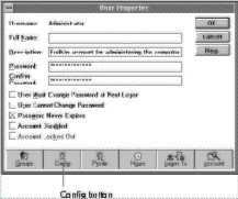 The Config button in the User Manager for Domains, which accesses the WinFrame User Configuration dialog box