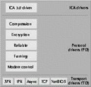 The ICA protocol stack is dynamically configured to meet the needs of each transport protocol. For example, the IPX protocol by itself does not guarantee packet delivery, so WinFrame adds a protocol driver to ensure that the data is reliably transmitted between the ICA connection and the host and that it is received by the client. However, because IPX is a frame-based protocol, a frame driver is not included in this particular ICA protocol stack. The Transmission Control Protocol (TCP), however, is a stream protocol; in this case, a frame driver is included. TCP is reliable; therefore, the Reliable protocol driver is not added to the stack. Figure 3-7 illustrates the ICA protocol stack and drivers.