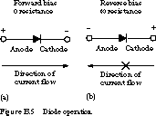 The device operates by allowing current to flow from anode to cathode, basically in the direction of the triangle. Recall that current is defined to flow from the more positive voltage toward the more negative voltage (electrons flow in the opposite direction). If the diode's anode is at a higher voltage than the cathode, the diode is said to be forward biased, its resistance is very low, and current flows. The diode is not a perfect conductor, so there is a small voltage drop, approximately 0.7 V, across it. If the anode is at a lower voltage than the cathode, the diode is reverse biased, its resistance is very high, and no current flows.
