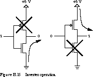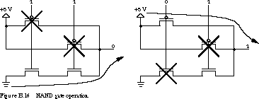 Figure B.14 shows transistor networks for (a) an inverter, (b) a two-input NAND gate, and (c) a two-input NOR gate. The power supply (+5 V) and ground (0 V) represent logic 1 and logic 0, respectively. The inverter is constructed from an nMOS and a pMOS transistor connected in series between power and ground. It operates as follows (see Figure B.15).