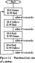 How are the inputs and outputs related? There are many ways to represent the functional behavior of a system, such as the flowchart shown in Figure 1.2. The start signal causes the green N-S lights and the red E-W lights to be illuminated. When the 45-second clock tick arrives, new outputs are turned on: the N-S green lights go off, the yellow lights go on, and the E-W lights stay red. After another 15-second clock tick, N-S yellow goes off, N-S red goes on, E-W red goes off, and E-W green goes on. A similar sequence of events happens when the light configuration changes to N-S red, E-W green, and then to N-S red and E-W yellow. After this, the whole process repeats.