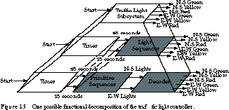 For example, Figure 1.3 shows one of the possible decompositions of the traffic light system. It is broken down into timer and light sequencer subsystems. The timer counts the passing of the seconds and alerts the other components when certain time intervals have passed. The light sequencer steps through the unique combinations of the traffic lights in response to these timer alerts.