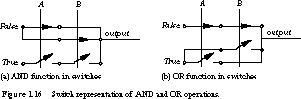 This is shown in Figure 1.16 for the implementations of AND and OR operations. Note how placing normally open switches in series yields an AND. When A and B are true, the switches close and a path is established from true to the output. If either A or B is false, the path to true is broken, and one of the parallel normally closed switches establishes a connection from false to the output.
