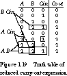 Figure 1.18 shows the truth table for the full adder, a circuit with two data inputs A and B, a carry-in input Cin, and the Sum and Cout outputs of the half adder. The three inputs have 23 unique binary combinations, leading to a truth table with eight rows.
