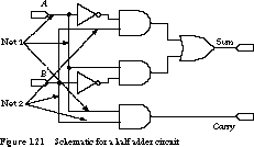 Example Schematics for the Half and Full Adder A schematic for the half adder is shown in Figure 1.21. The inputs are labeled at the left of the figure as A and B. The outputs are at the right, labeled Sum and Carry. Sum is the OR of two ANDed terms, and this maps directly onto the three gates as shown in the schematic. Similarly, Carry is described in terms of a single AND operation and thus maps onto a single AND gate. The figure also shows two different nets, labeled Net 1 and Net 2. The former corresponds to the set of wires carrying the input signal A; the latter are the wires carrying signal B.