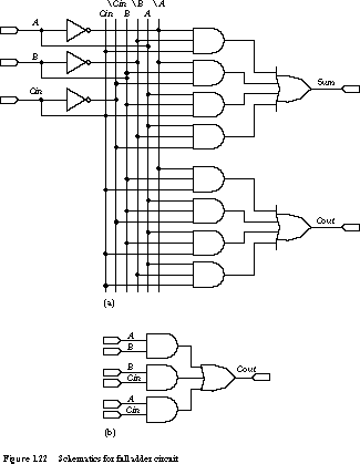 The full adder's schematic is given in Figure 1.22(a). Each of the outputs is the OR of four 3-variable product terms. The OR operator is mapped into a four-input OR gate, while each product term becomes a three-input AND gate. Each connection in the schematic represents a physical wire among the components. Therefore, there can be a real implementation advantage, in terms of the resources and the time it takes to implement the network, in reducing the number of gates and using gates with fewer inputs.