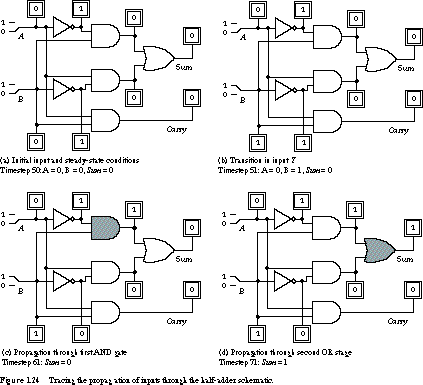Example Tracing Propagation Delays in the Half Adder Looking in particular at time step 51, the B input changes from 0 to 1. Twenty time units later, the Sum output changes from 0 to 1. Why does this happen?