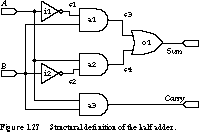 -- internal signal wires SIGNAL s1, s2, s3, s4: BIT; BEGIN -- one line for each gate, describing its -- type and its connections i1: inverter_gate PORT MAP (A, s1); i2: inverter_gate PORT MAP (B, s2); a1: and_gate PORT MAP (B, s1, s3); a2: and_gate PORT MAP (A, s2, s4); a3: and_gate PORT MAP (A, B, Carry); o1: or_gate PORT MAP (s3, s4, Sum); END structural;The entity declarations declare the block diagram characteristics of a component-that is, the way it looks to the outside world. The architecture declarations define the internal operation. Usually these are written in a form that looks much like programming statements. The inverter, AND, and OR behaviors are so simple that they do not do justice to VHDL's capability of expressing hardware behavior. This definition of the half adder is entirely structural: it is merely a textual form of specifying the schematic, shown in Figure 1.27.