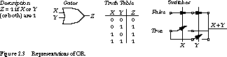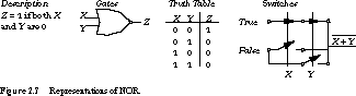 NOR behaves in a similar fashion, but now with respect to OR. Once again the truth table outputs are complemented, and we draw the NOR gate as an OR gate with a bubble at the output. The switch representation in Figure 2.7 shows a topology like the OR gate of Figure 2.3, with the true and false inputs reversed. Both X and Y must be zero to close the normally closed switches and establish the path from true to the output.