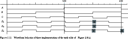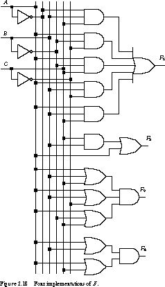 Figure 2.18 shows the four different gate-level implementations for F discussed so far: canonical sum of products (F1), minimized sum of products (F2), canonical product of sums (F3), and minimized product of sums (F4). In terms of gate counts, the product of sums canonical form is more economical than the sum of products canonical form. But the minimized sum of products form uses fewer gates than the minimized product of sums form. Depending on the function, one or the other of these forms will be better for implementing the function.