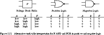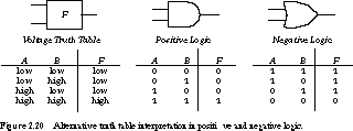 Consider Figure 2.20, which shows a truth table expressed in terms of two relative voltages, high and low. Under the interpretation of positive logic, the truth table describes an AND function. But if we interpret the voltage levels according to negative logic, we obtain an OR function instead. This follows because an OR function and an AND function are duals, derived by replacing 0's in one truth table with 1's in the other, and vice versa.