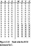 Figure 2.23 shows the truth table for a BCD increment by 1 circuit. Each BCD number is represented by four Boolean variables, A B C D. The output of the incrementer is represented by four 4-variable Boolean functions, W X Y Z.