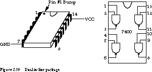 The figure also shows the pin connectivity for a 14-pin package containing four 2-input NAND gates. Notice how the pins are connected within the package to the gates' inputs and outputs. Usually, related input and output pins are adjacent on the package, but this is not always so. You should always consult the logic family's data book for component pin-out maps.