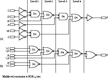 In this section we will be concerned with two issues: how to express logic networks solely in terms of NAND and NOR gates, and how to take advantage of multilevel logic to reduce the overall gate count.