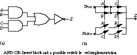 Figure 3.11(a) shows the logical view of the AOI block, and Figure 3.11(b) gives a possible implementation in terms of switches. If A and B are true or C and D are true, the normally open switches establish a closed path from false to output Z.