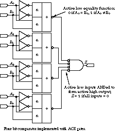 Example A 4-Bit Comparator Let's say your task is to implement a 4-bit comparator. Such a circuit has eight inputs organized as two sets of four input bits, labeled A3 through A0 and B3 through B0. The circuit's single output Z is asserted when A3 = B3, A2 = B2, A1 = B1, and A0 = B0. We assume that we have only inverters, NOR gates, and AOI gates.