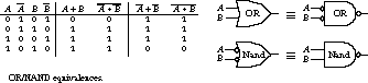 In essence, a NAND function can be implemented just as well by an OR gate with its inputs inverted. Similarly, a NOR function can be implemented by an AND gate with its inputs complemented. The conversion from one form to the other is often called "pushing the bubble." This is simply a way to remember DeMorgan's theorem. As the bubble "pushes through" an AND shape, it changes to an OR shape with bubbles on the inputs. Similarly, pushing the bubble through an OR shape transforms it to an AND shape with bubbles on the inputs.