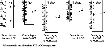 See Figure 3.15 for a sample collection of schematic shapes. The 7451 package contains two 2-input 2-stack AOI gates. This particular package has 14 pins. The two gates use 10 of these (4 inputs, 1 output times 2), plus power and ground. This leaves two unconnected pins (the 74LS51, not shown in the figure, takes advantage of these previously unused connections by providing one 3-input 2-stack AOI gate and one 2 ¥ 2 gate). Other components include the 7454 2-input 4-stack AOI gate (the 'LS version comes with two 2-input stacks and two 3-input stacks), the 74LS55 4-input 2-stack AOI gate, and the 74S64 AOI gate, constructed from a 4-input stack, two 2-input stacks, and a 3-input stack.